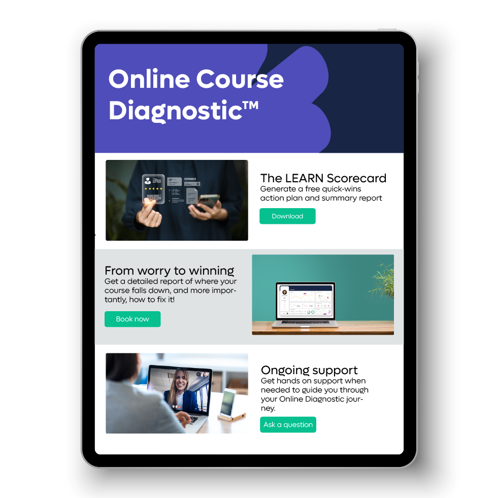 The Online Course Diagnosticâ˘Â brings corporate-level learning design expertise to the online course world â so your learners finish, love, and buy from you again.